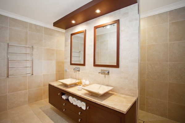 - Both bathrooms contain floor-to-ceiling tiles and marble bench tops and double vanities with the main also featuring a spa bath