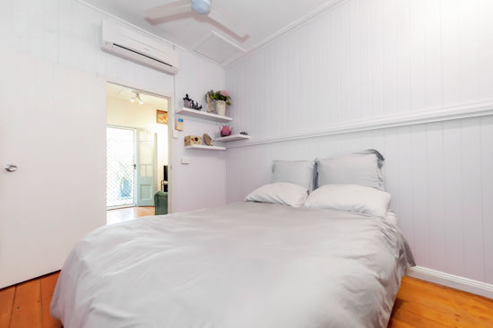 - Two bedrooms with high ceilings and fans, one of which has a split-system air-conditioner