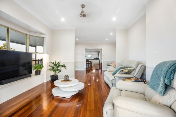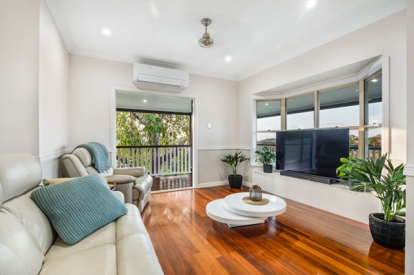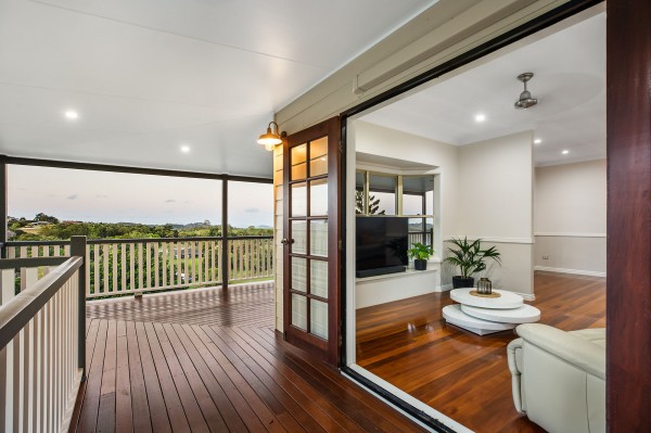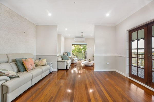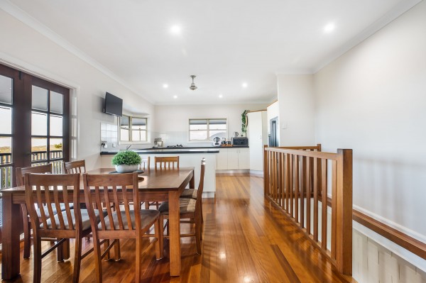 - Modern federation Queenslander-style home with traditional charm, timber doors and large windows, high ceilings, and polished timber floorboards