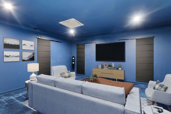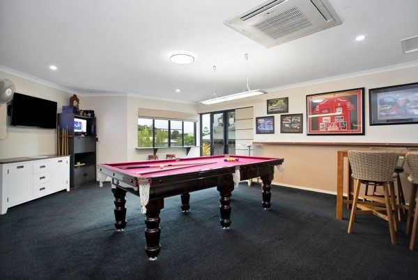 - Multiple living areas include a multiple purpose room upstairs, a media room and a rumpus room complete with kitchenette and a timber dry bar