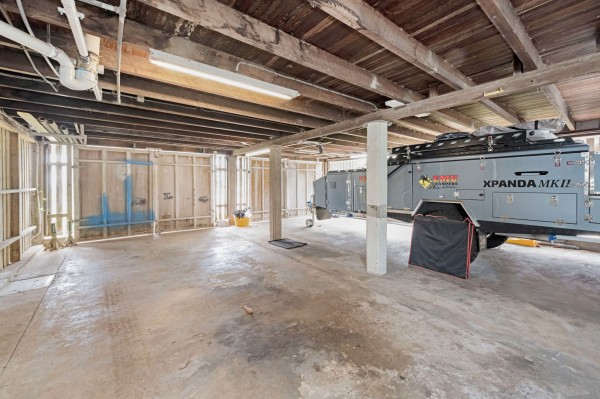 The enclosed downstairs area includes heaps of space for storage and tools, a laundry, second toilet and parking for several vehicles.