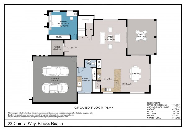 - 4-bedroom home (one currently utilised as a study),2 bathrooms, 3 toilets and 4 living spaces
