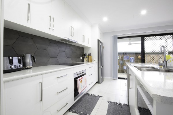 - Stylish kitchen with modern appliances, feature splash back and breakfast bench