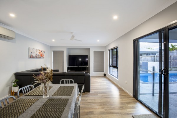 -	Kitchen is adjacent to the family room with living and dining areas that all look out to the backyard and pool, meaning you can keep an eye on the kids easily