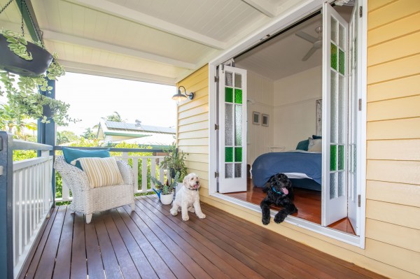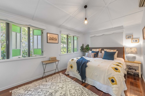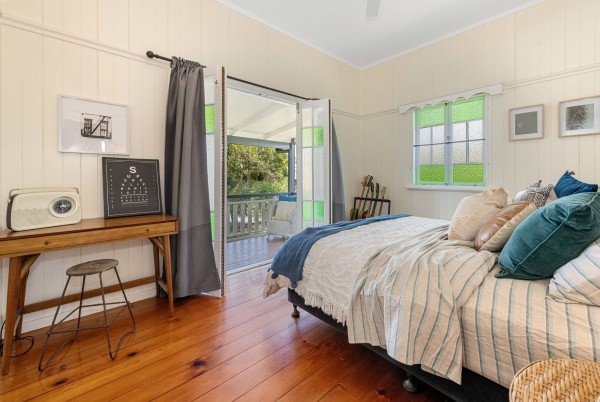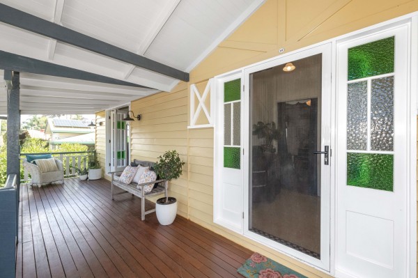 • Three bedrooms, all with split system air-conditioners and two with built-in wardrobes. The master bedroom flows easily through stained glass French doors out to the front deck, an extra sanctuary to relax and enjoy the street-scape