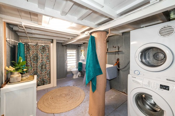 • Under the house is a second toilet and shower as well as the laundry, end-to-end parking for two cars and lots of storage space including an enclosed room