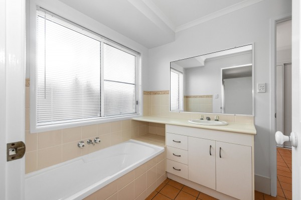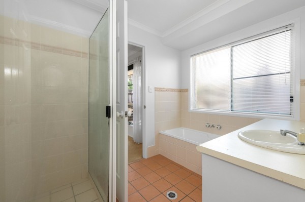 The bathroom is sparkling and features a bath, separate shower and has access from the hallway and the main bedroom.