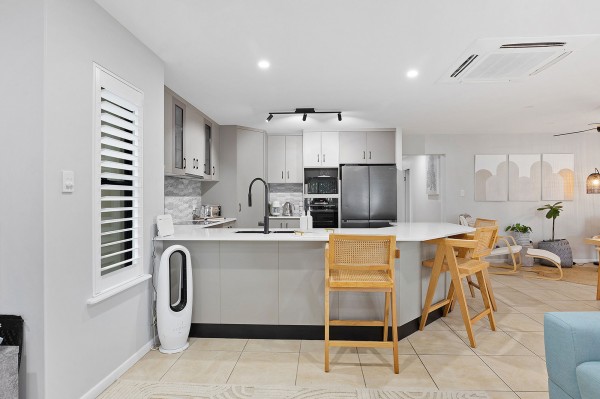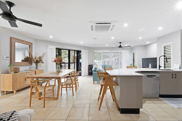 - Open plan living and dining area with air conditioning and a neutral colour scheme perfect for beachside living
