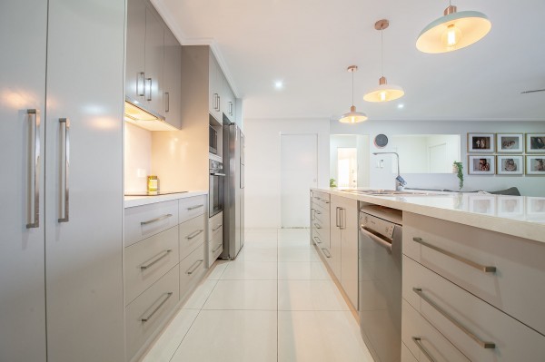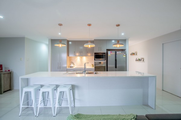- The kitchen is designed with quality cabinetry, tapware and pendant lighting over the central island bench