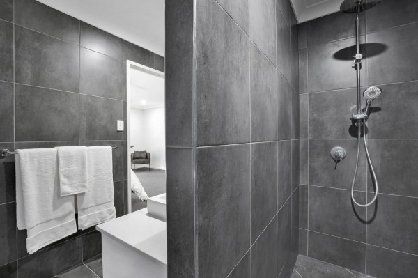 The enormous carpeted master suite, a haven of pure indulgence, exudes an aura of luxury, boasting a walk-in robe that tantalizes with its promise of sartorial opulence. The split air-conditioning soothes the senses, while overhead fans stir the air with a delicate breeze. The ensuite, an exquisite sanctuary, presents an escape from the ordinary, where sleek finishes, a stunning black textured tile and lavish amenities elevate the everyday to the extraordinary.