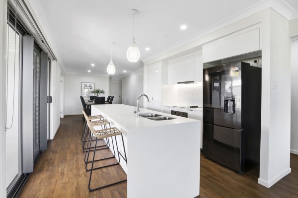 Step foot into a world of refined luxury as the open plan kitchen and dining area unfolds before your eyes, inviting you to indulge in a symphony of culinary delights. Adorned with quality appliances and with delightful pendant lighting, the gourmet kitchen stands as a testament to the harmonious fusion of style and functionality. A sanctuary of culinary inspiration provides ample space for your epicurean treasures, while lustrous stone benches exude an air of sophistication.