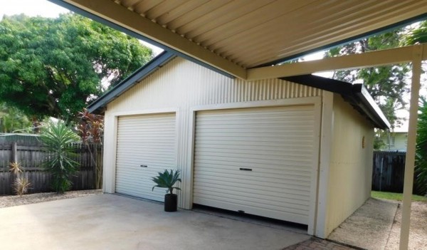 - A high-clearance carport provides space for larger vehicles, alongside a versatile two-bay shed.