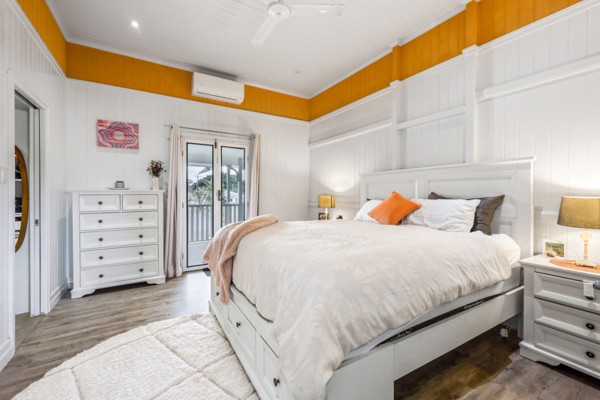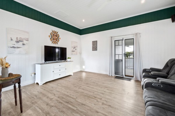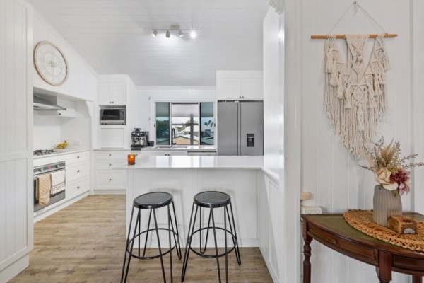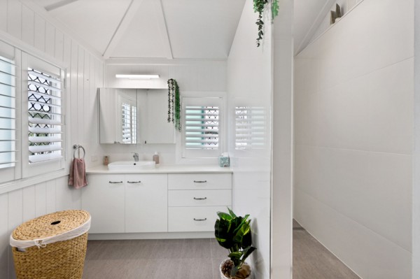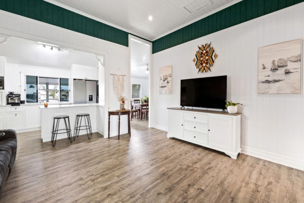 - Renovated Queenslander with high ceilings, vinyl plank flooring, and classic VJ wall panelling