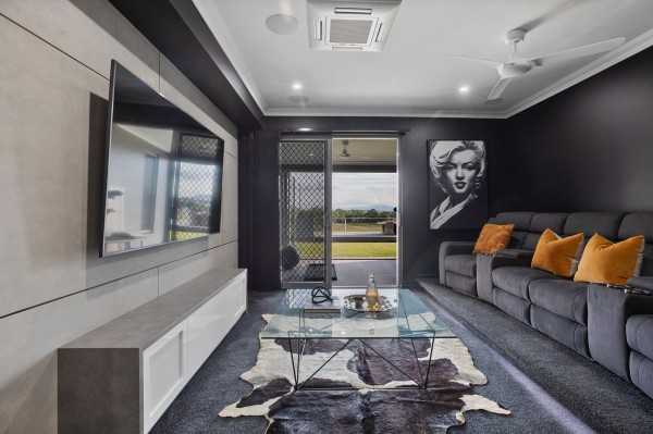 - Home theatre with tiered seating, blackout curtains, surround sound, iPad controls and included cinema couch