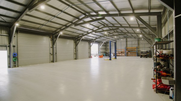 - 2 open bays, 4 roller doors, wash trough, wall-mounted industrial fan