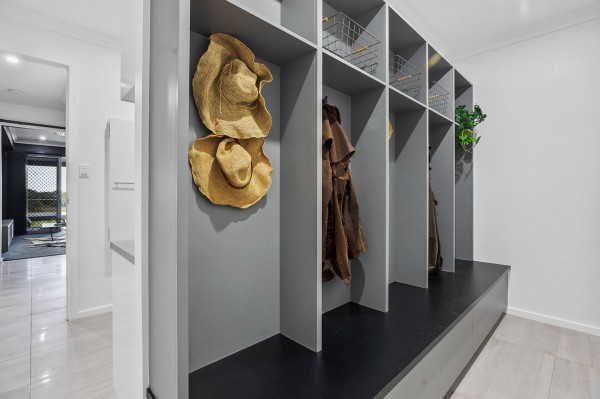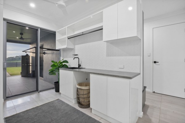 - Spacious laundry with built-in cabinetry, pull-out hampers, drying rail, external access to a covered drying patio, and an adjoining mudroom with storage-great for managing boots, gear, and farm life mess with ease