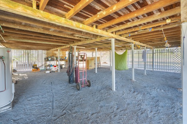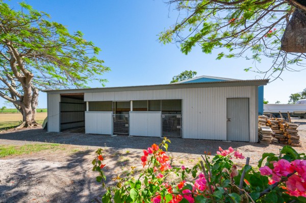 The other half of the property includes the house, a high-clearance four-bay carport, a high-clearance three-bay shed, stables, and a terrific chook shed.