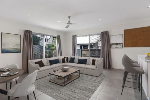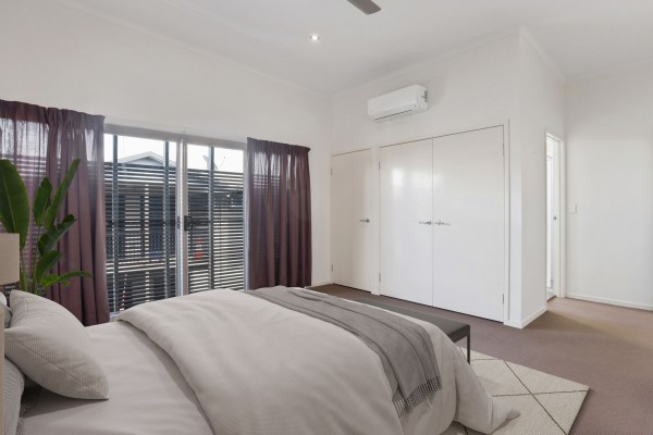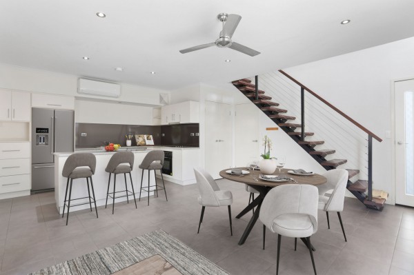Welcome to a modern, light-filled residence designed to blend comfort with style and practicality. The moment you step inside, you're greeted by a spacious open-plan living area with soaring ceilings and split system air conditioning, ensuring a cool and inviting atmosphere year-round. The timber staircase, complemented by an expansive staircase void, serves as a centrepiece, guiding you to the private quarters upstairs.