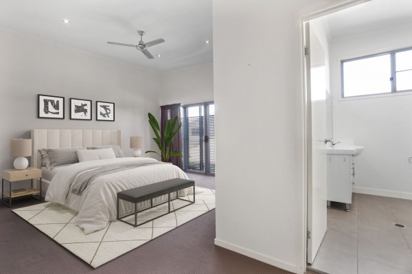 Upstairs, the private accommodations include three generously sized bedrooms, each equipped with built-in robes and air conditioning for added comfort. The enormous master suite is a standout, offering an elegant retreat complete with super high ceilings, ample storage, a luxurious ensuite, and access to a quaint balcony. The additional bedrooms share a thoughtfully designed two-way bathroom, balancing functionality with privacy.