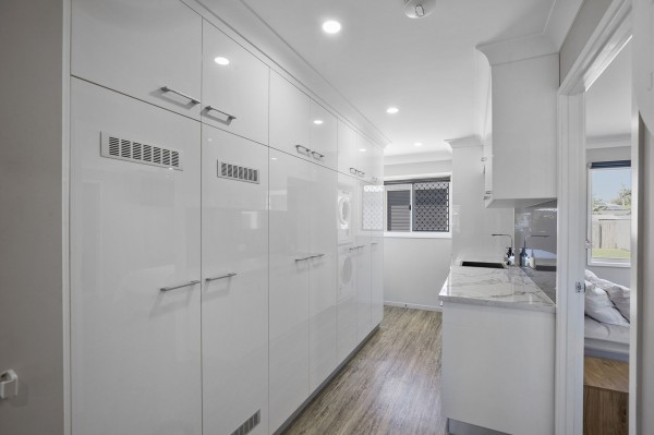 - A spacious laundry provides plenty of storage for a busy family home and convenient access to the back patio