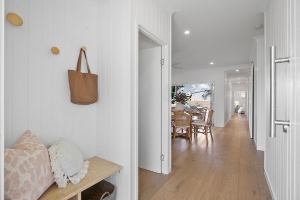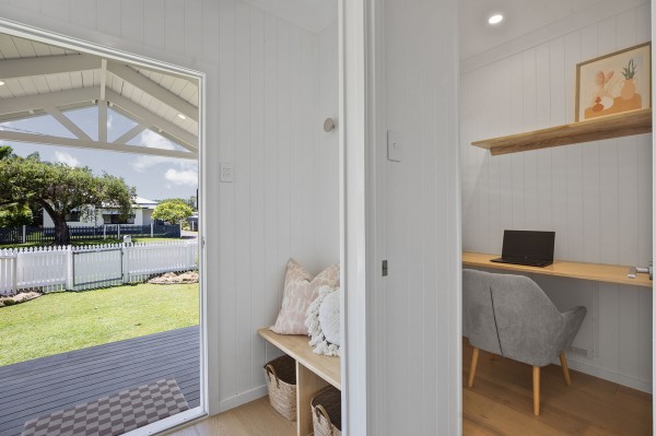 - Office nook with built-in timber desk and dedicated storage next to the entry for everyday essentials