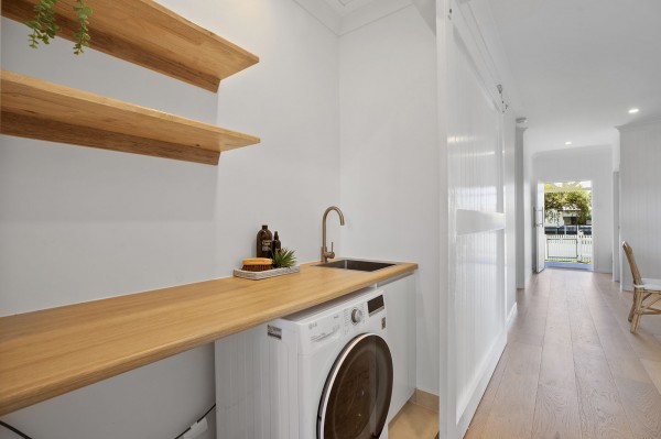 - European laundry cleverly tucked behind a sliding timber barn door for maximum space efficiency
