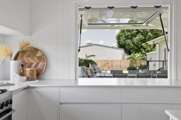 The heart of the home is the light-filled kitchen, featuring stone benchtops, gas cooktop with window splashback, and a servery window that creates a perfect connection between indoor and outdoor living. The open-plan design flows effortlessly onto the expansive timber deck-an entertainer's dream with soaring exposed beam ceiling and ample space to relax.