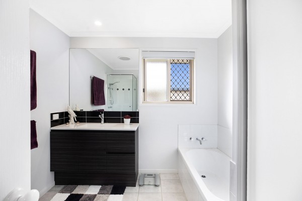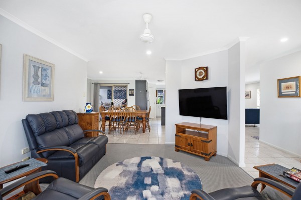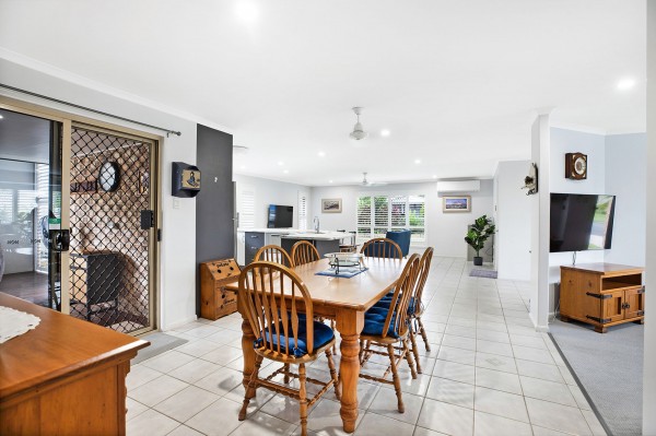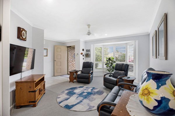 - Open-plan tiled kitchen, living and dining area with air conditioning and access to the rear deck, plus a carpeted formal lounge with bay window and plantation shutters.