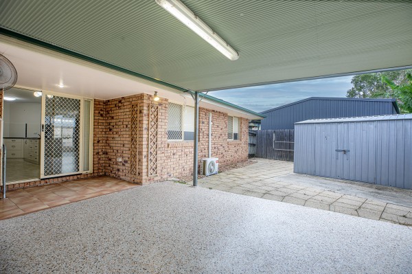 - Private undercover patios with epoxy-finished concrete and outdoor storage sheds