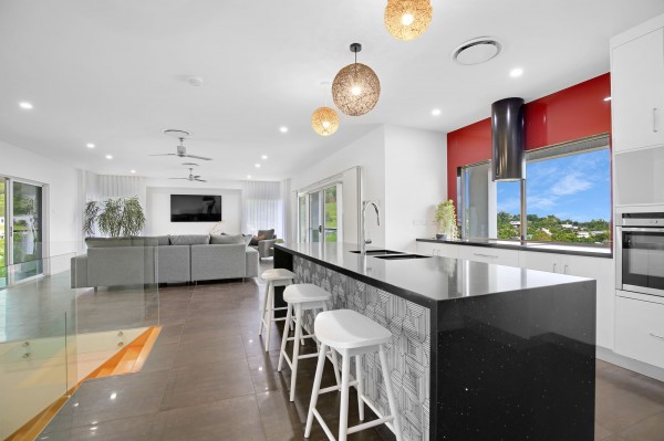 - At the heart of the home, the modern kitchen stands out with its stone benchtops, 2-Pac cabinetry and walk-in pantry, all complemented by a glass window splashback that frames the rural views
