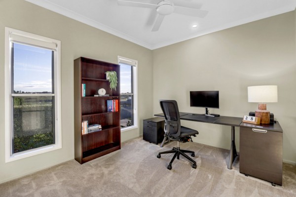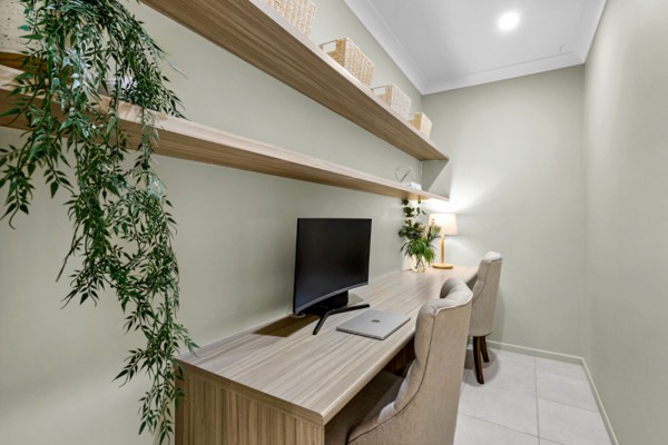 - Dedicated office nook with timber-look benchtops and built-in shelving, paired next to the front bedroom which is also currently used as a home office