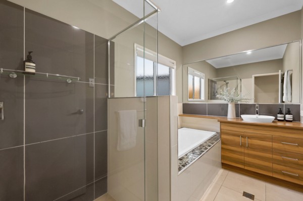 - Stylish main bathroom with floor-to-ceiling tiles, timber-look vanity, walk-in shower, bath, and separate toilet