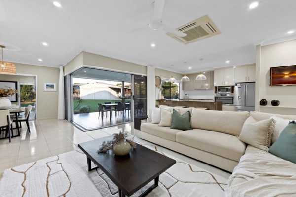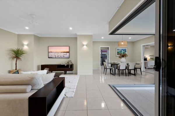 - Expansive open-plan living and dining areas with pendant lighting and seamless connection to the outdoor patio through corner sliding doors