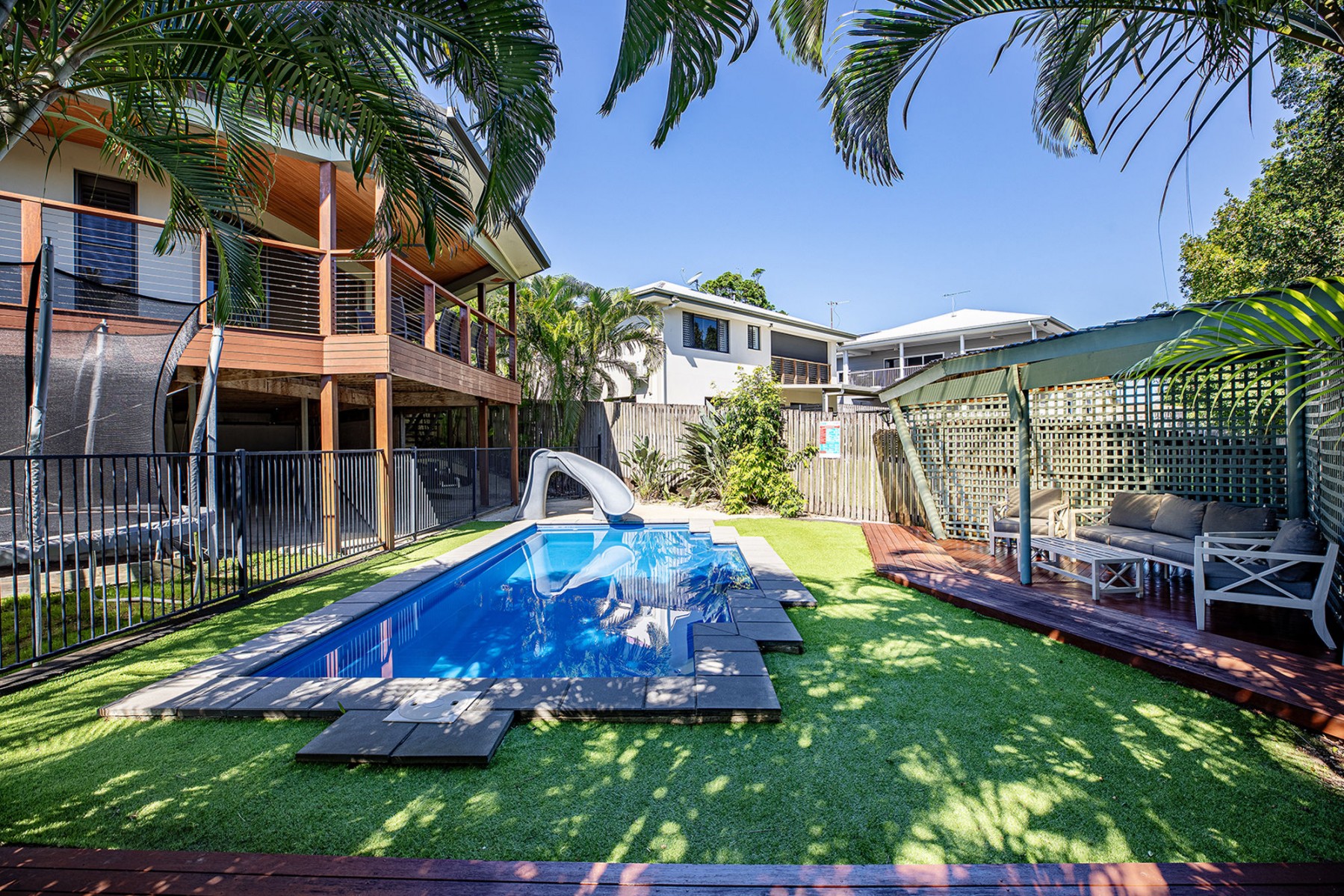- Expansive covered timber deck with ceiling fan, perfect for entertaining and overlooking the stunning in-ground pool with waterslide