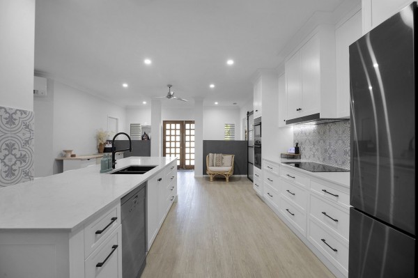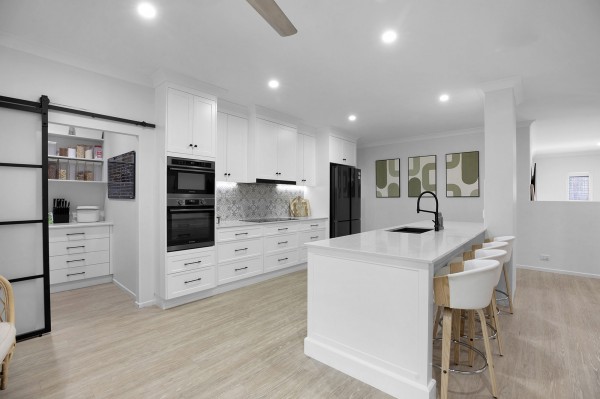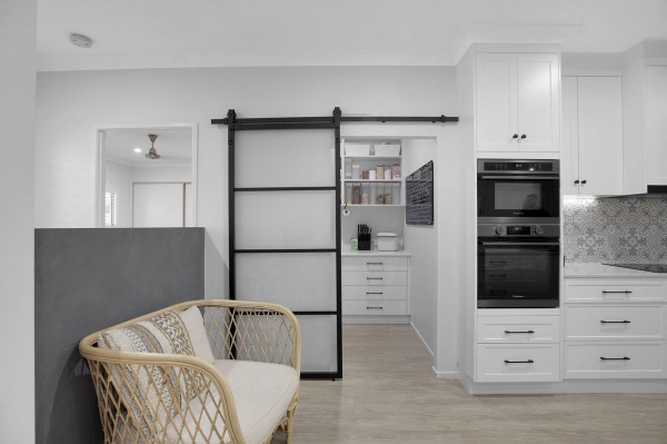 - Stunning kitchen with crisp white shaker cabinetry, stone benchtops, stylish black accents, and a generous walk-in pantry tucked behind a sleek black metal sliding door- a dream for home cooks and entertainers alike