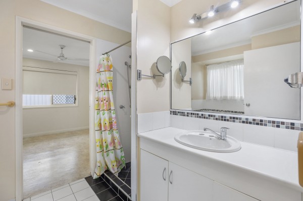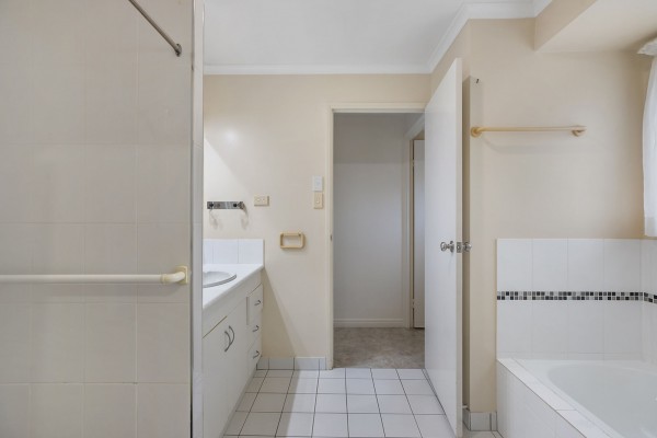 - Two-way bathroom with shower, bath, vanity + separate toilet
