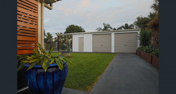 - Two-bay semi-enclosed carport with roller door for secure parking