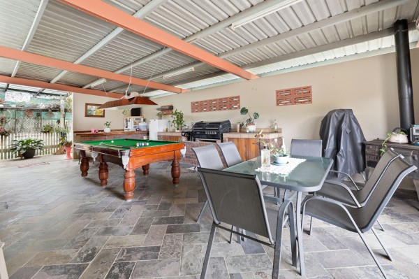 - Expansive built-in entertaining area with bar, BBQ, wood-fired heater, and huge tiled pizza oven