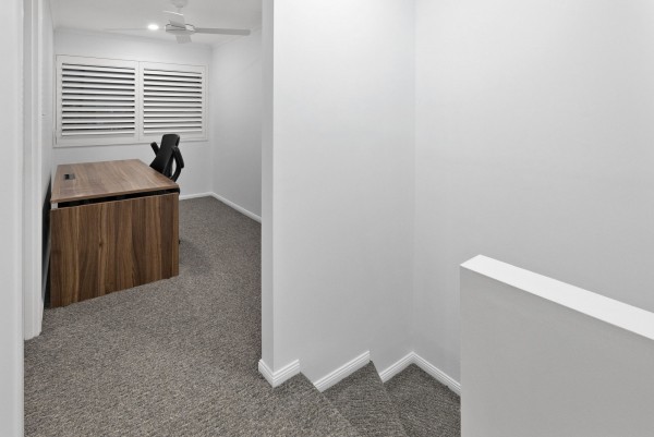 The property flows over three levels with the front door and garage on the ground level, the living area, bathroom, second toilet, laundry and back door leading out to the courtyard on the second level, and the two bedrooms, study and bathroom on the third level.