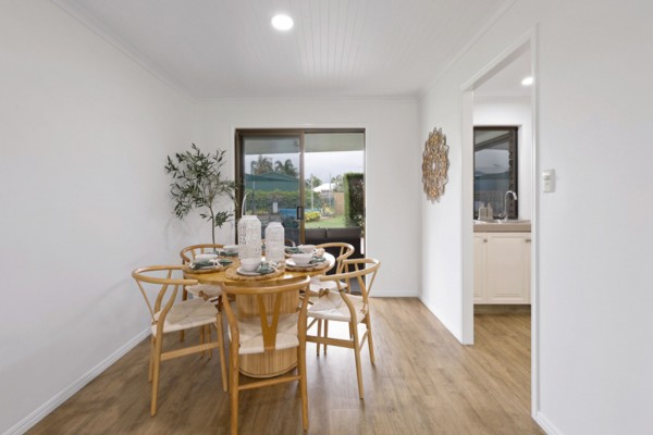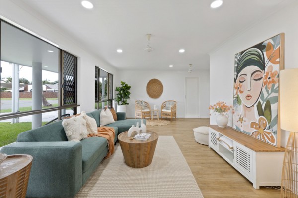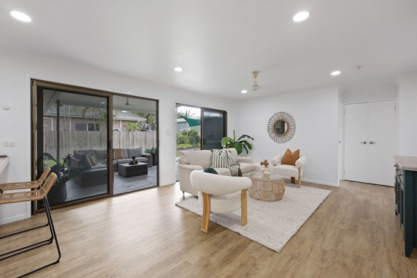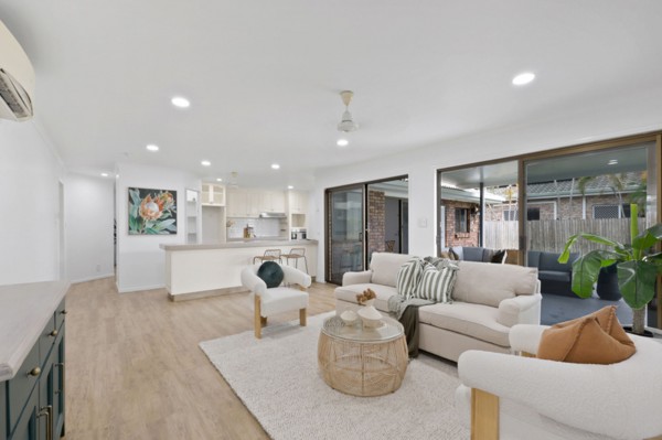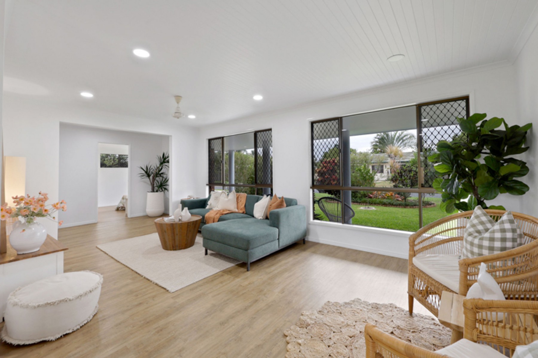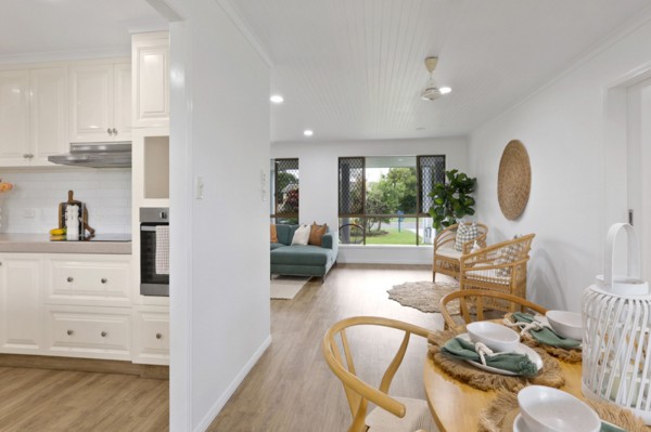 - Light-filled main living area with coastal-inspired panelled ceiling feature adding subtle beach house charm
