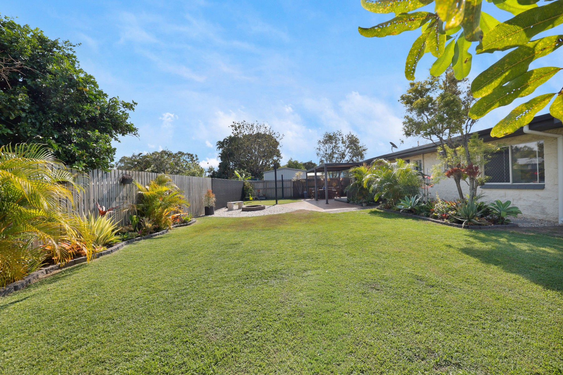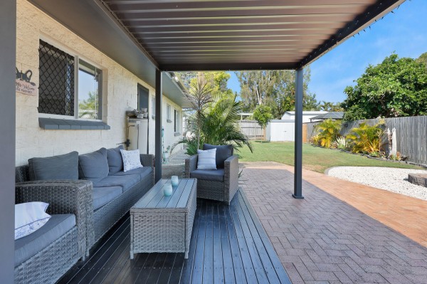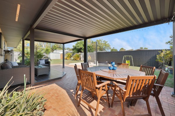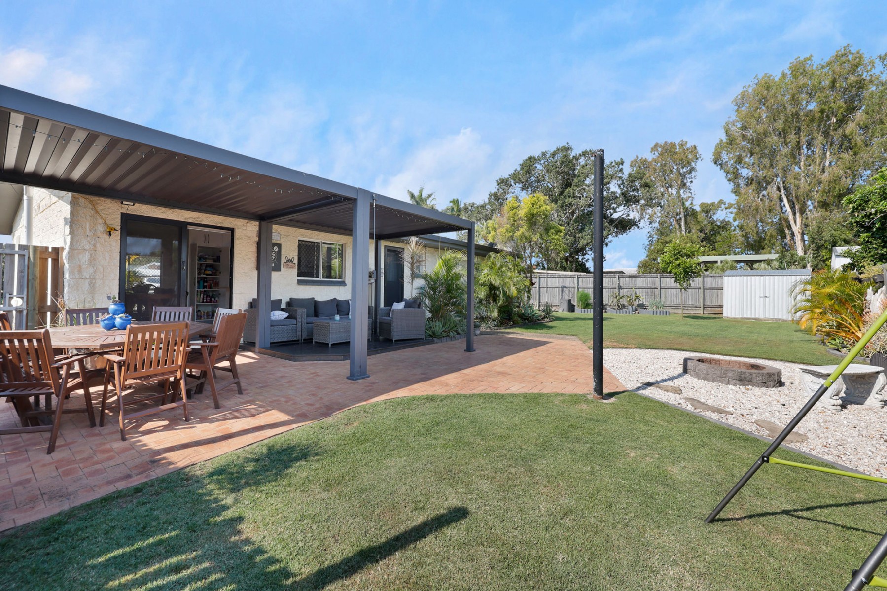 - Large patio area is under cover, includes a practical deck and overlooks the beautiful backyard and outdoor fire pit area