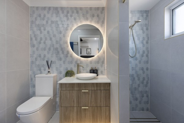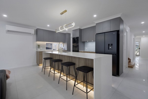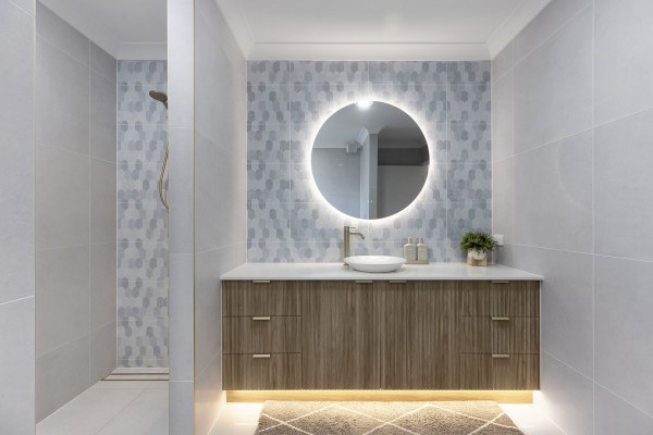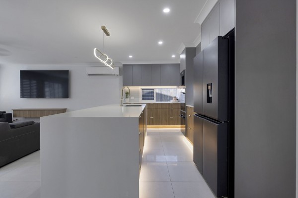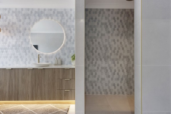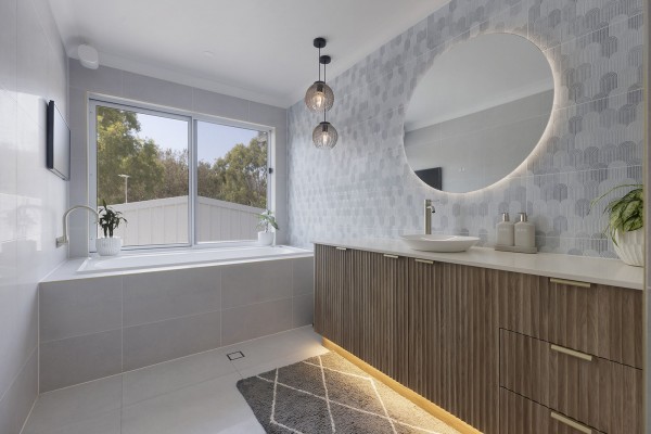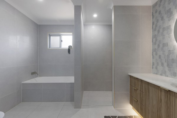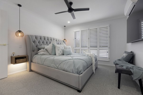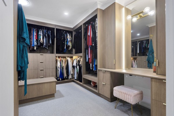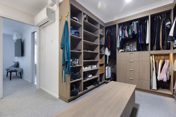 - The upper-level master bedroom offers a spa-inspired ensuite with a timber vanity, feature wall tiles and soft ambient lighting, complemented by a custom-designed dressing room with timber laminate cabinetry- creating a private retreat