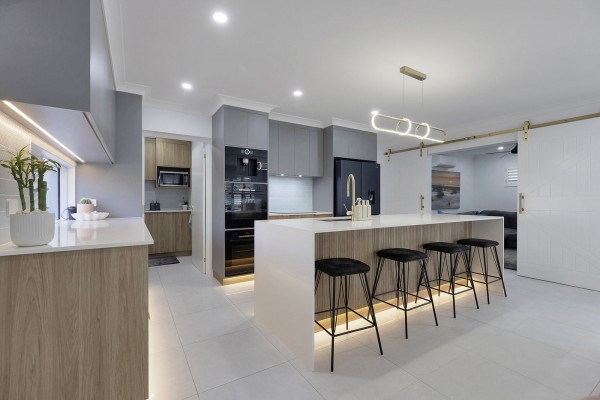 - Chef's kitchen with premium Bosch appliances, built-in coffee machine, stone benchtops, timber-look cabinetry with gold hardware and a generous butler's pantry with sink and storage