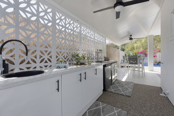 - Covered alfresco with outdoor kitchen and bar- complete with sink, fans and room for entertaining year-round