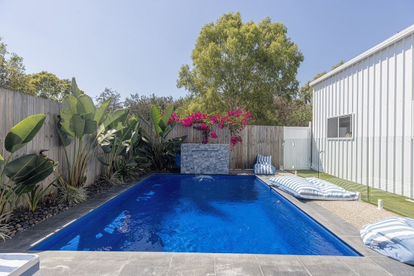 - Resort-inspired magnesium pool with waterfall feature, framed by tropical gardens and landscaped surrounds