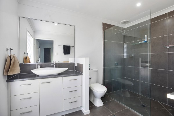- Bright family bathroom with bath, large vanity and walk-in shower; separate toilet