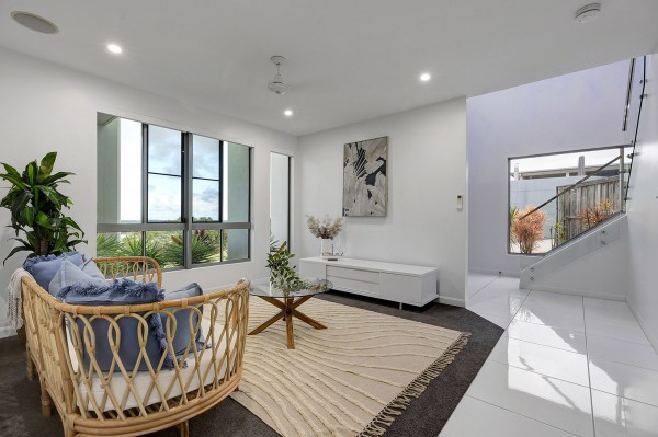 - Timber flooring upstairs adds warmth and a relaxed feel, while large-format white tiles enhance the downstairs living spaces with a fresh, modern touch