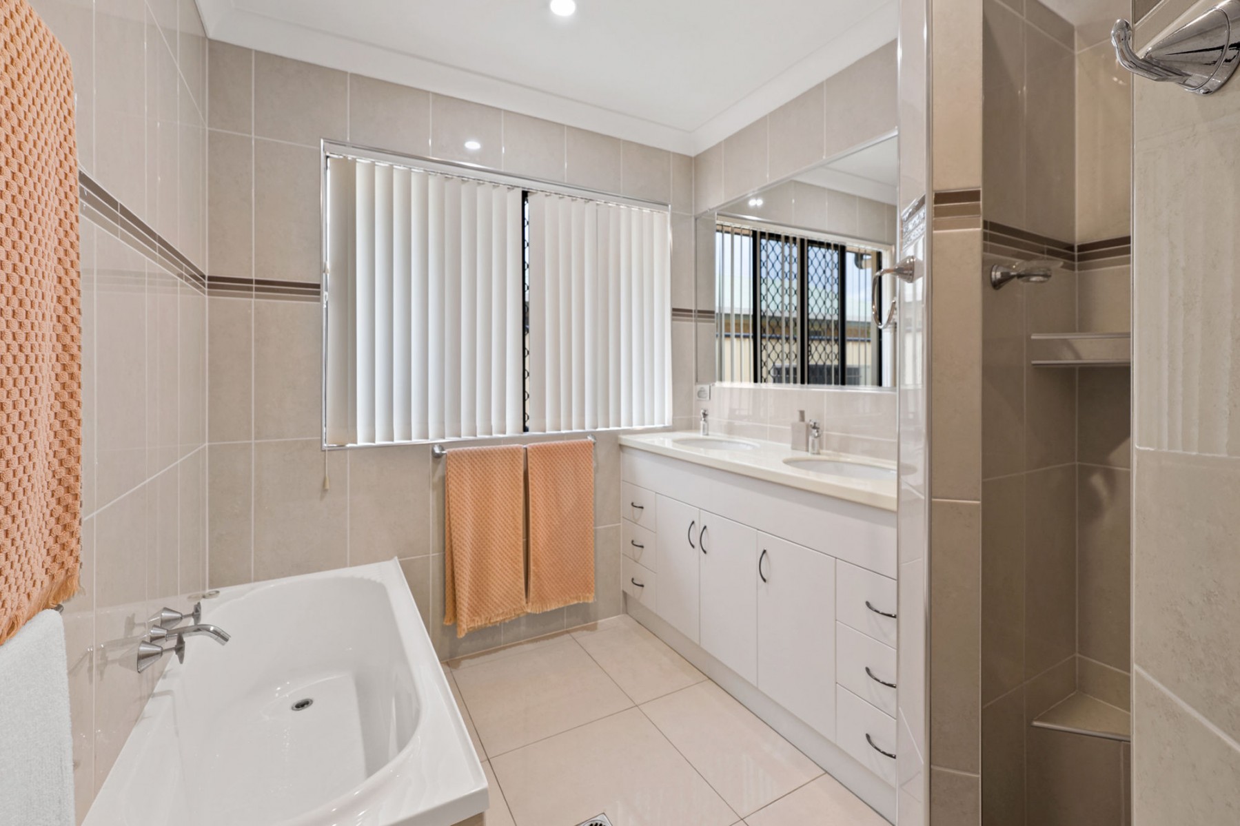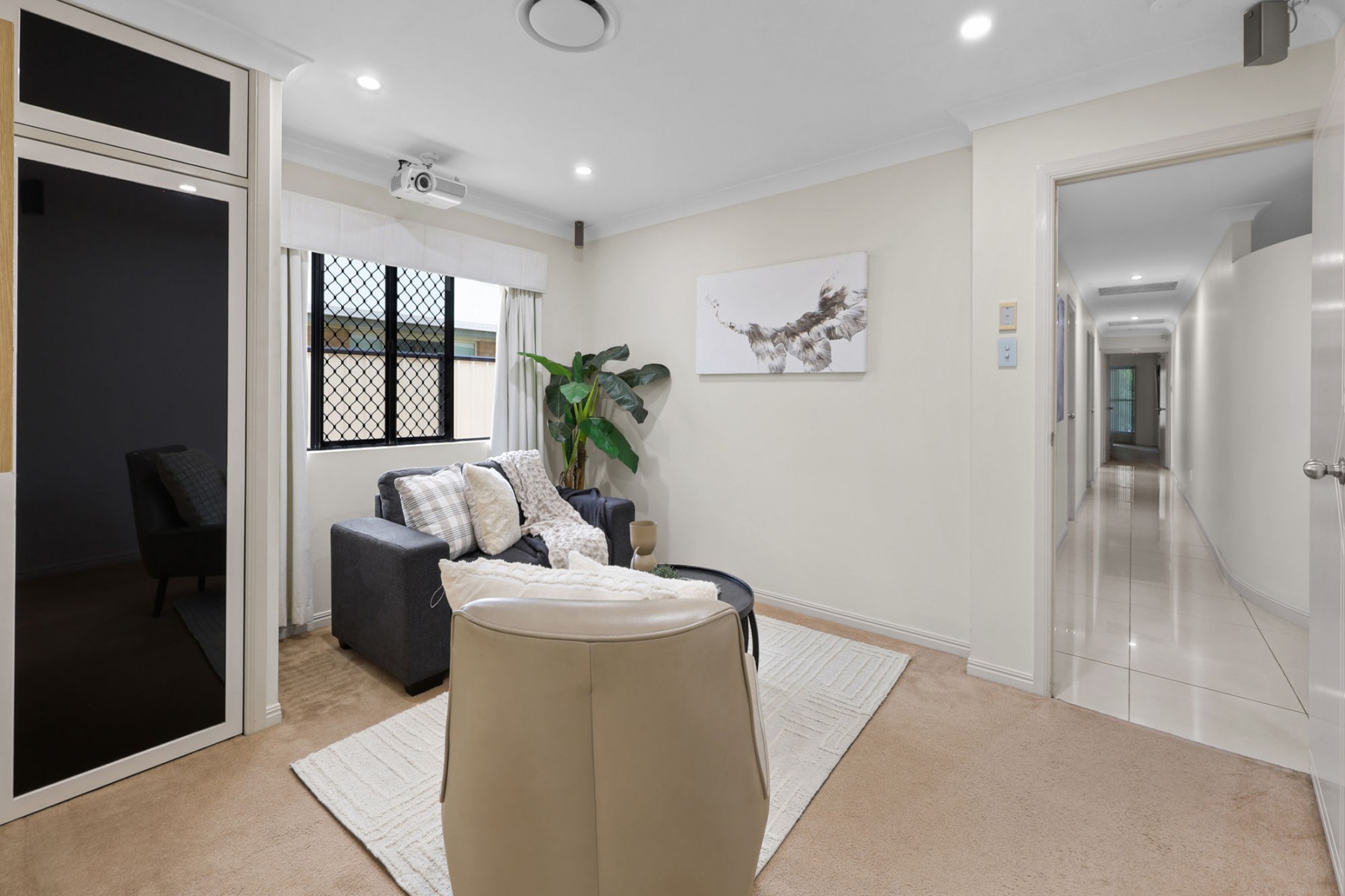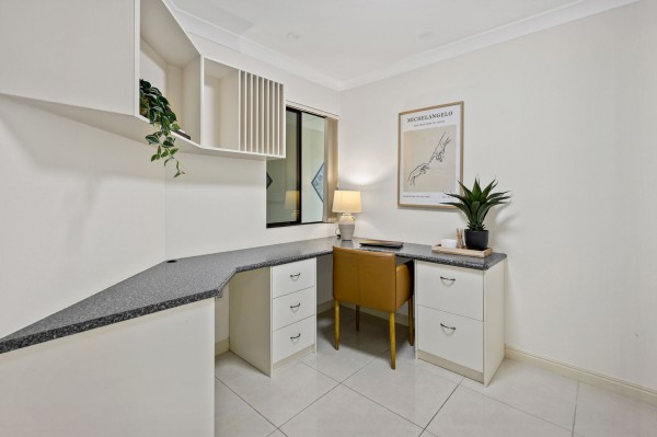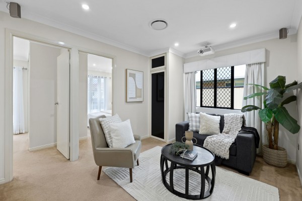 The media room/second living comes fully equipped with projector, surround sound and built-in cabinetry. It is located near two of the secondary bedrooms, allowing it to serve perfectly for a full child's retreat as well. All three secondary bedrooms are queen size or bigger and the main bathroom has twin vanities, classy shower recess and floor to ceiling tiles.
