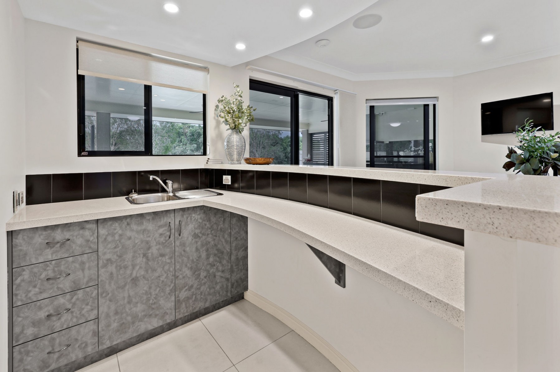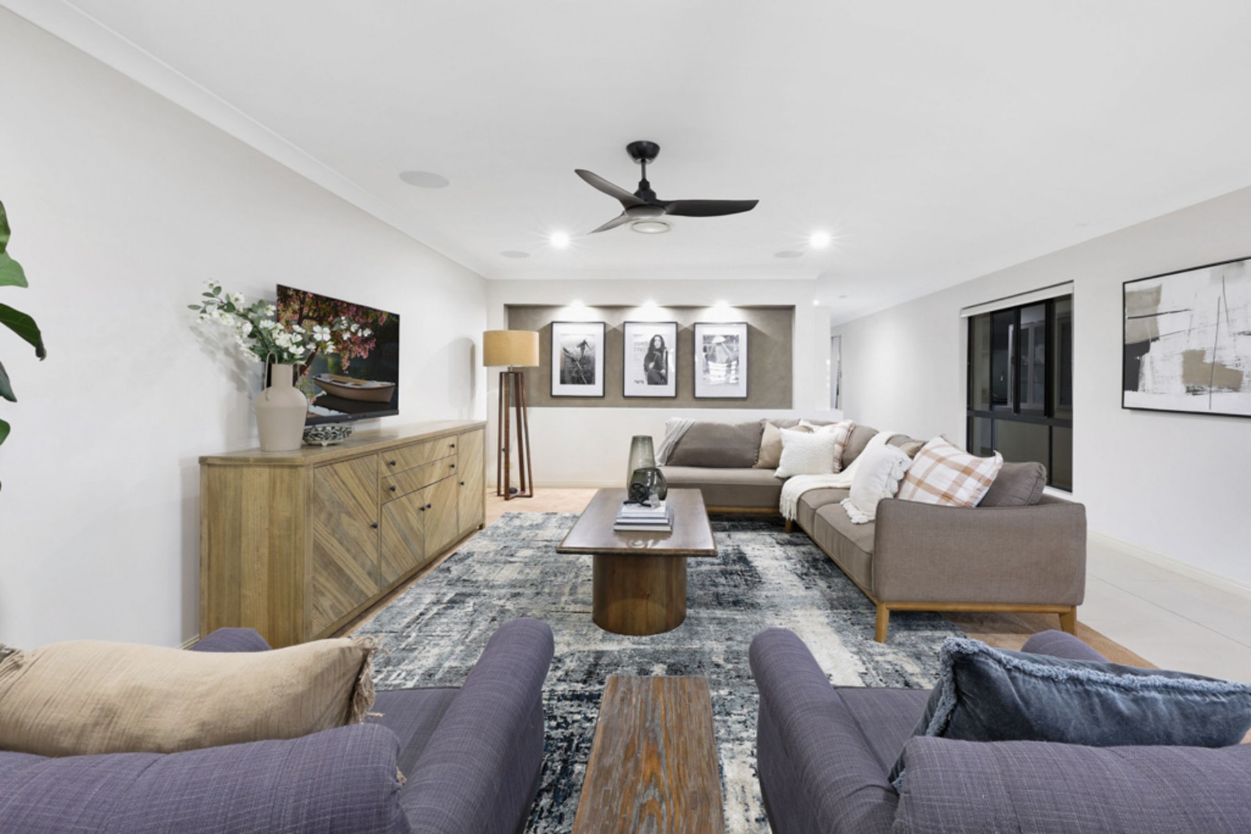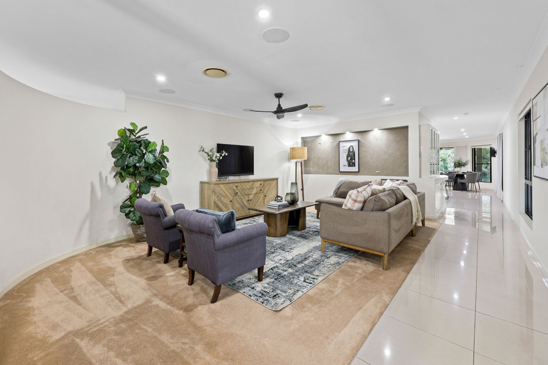 The media room/second living comes fully equipped with projector, surround sound and built-in cabinetry. It is located near two of the secondary bedrooms, allowing it to serve perfectly for a full child's retreat as well. All three secondary bedrooms are queen size or bigger and the main bathroom has twin vanities, classy shower recess and floor to ceiling tiles.
