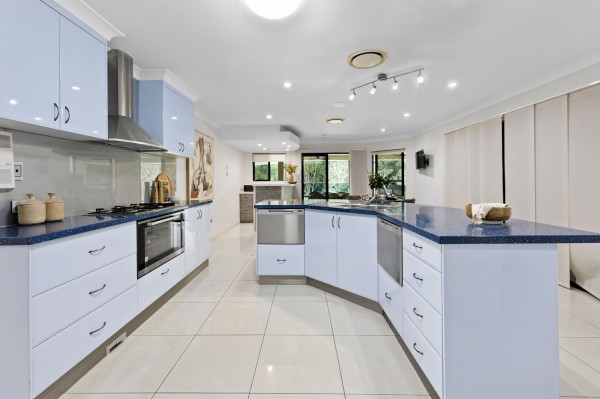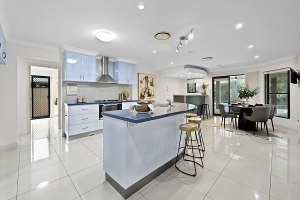 Inside, the home features a full-size office off the entry foyer, vast formal lounge and dining rooms, and a kitchen with oversized plumbed fridge space, twin dishwashers, 900mm oven, gas cooktop and a powered walk-in pantry. There is a stylish separate bar area that can service both inside and out.